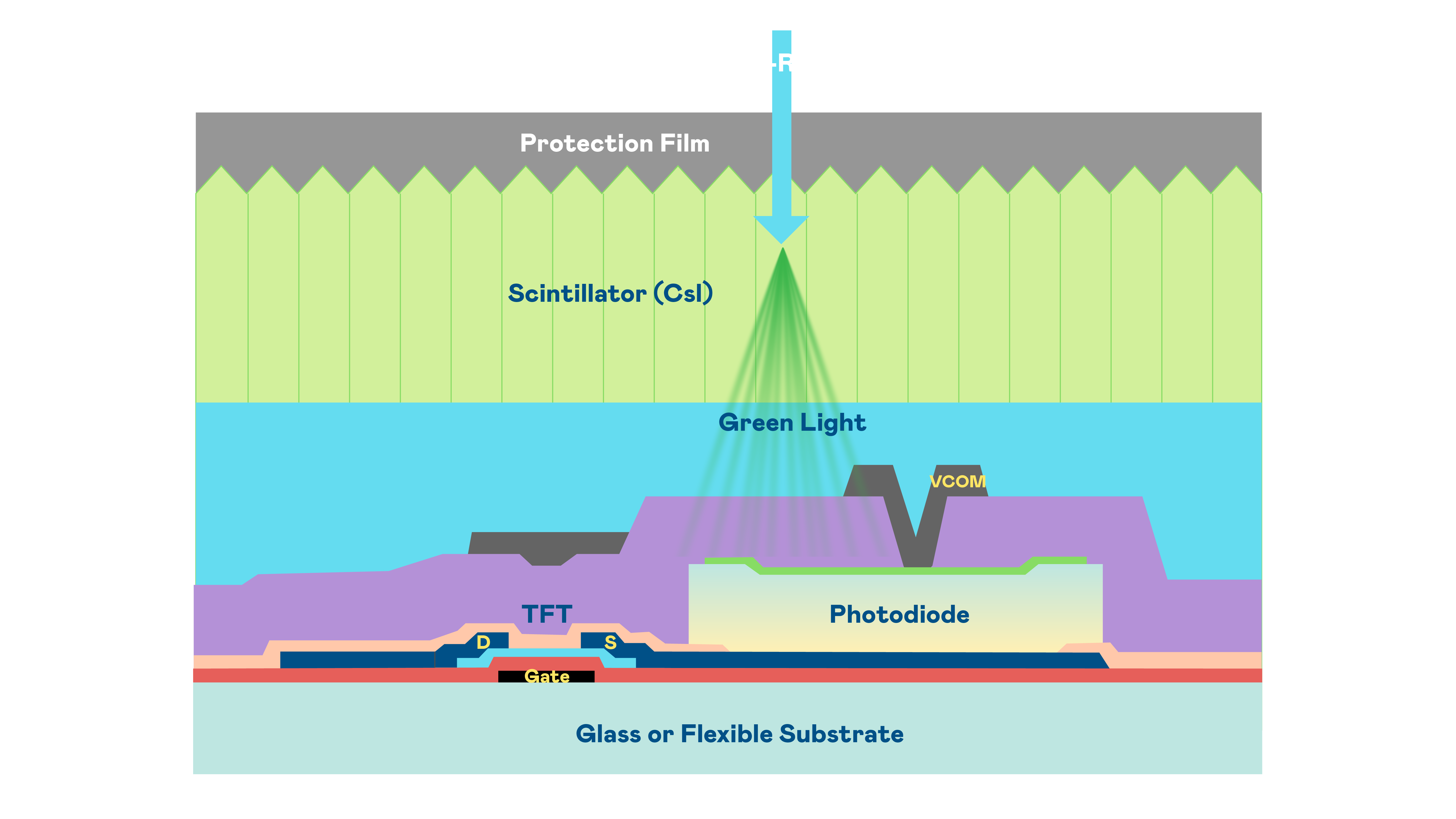 鼎博的X光影像感測陣列使用薄膜電晶體 (TFT) 作為每個像素的讀取開關,搭配光電二極體(Photodiode)的光電轉換元件,用以感測X光影像訊號。